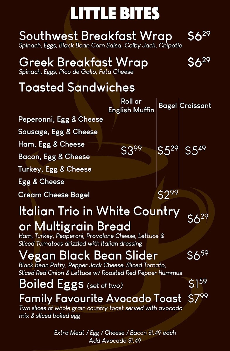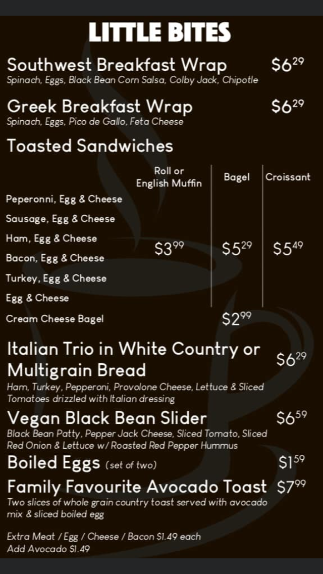 The menu’s approachable variety fits seamlessly into the café’s easygoing vibe, providing options that cater to those seeking quick, nourishing meals as well as those looking to unwind with a carefully made cup. Overall, it’s a place where the simplicity of good food and well-crafted drinks match the welcoming feel of the space.